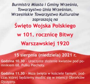 Burmistrz Miasta i Gminy Września, Towarzystwo Unia Wrześnian oraz Wrzesińskie Towarzystwo Kulturalne zaprasza na uroczystości Święta Wojska Polskiego w 101 rocznicę Bitwy Warszawskiej 1920, które odbędą się 15 sierpnia.